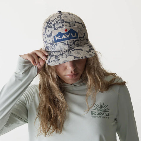 Design: A classic 6-panel trucker hat featuring a bold, embroidered KAVU logo patch on the front.