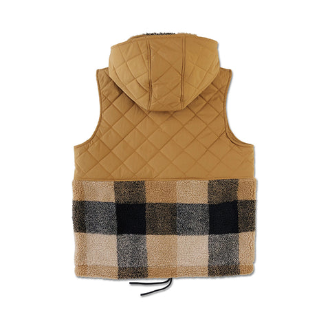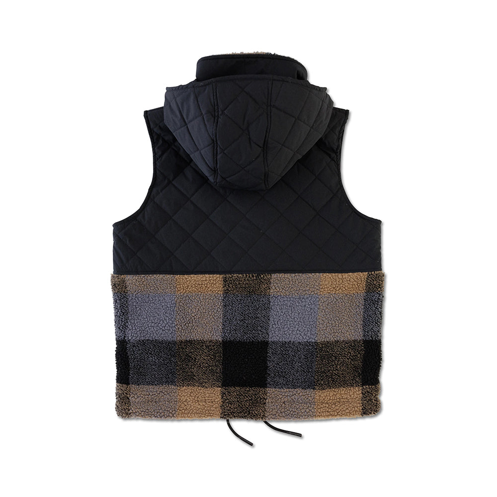 Relaxed fit, insulated mock neck fleece vest with three panel zip off detachable hood, front placket with snap closure, woven quilted fabric on hood and front/back yoke, jersey lined hand pocket bags, straight hem with drawcord.