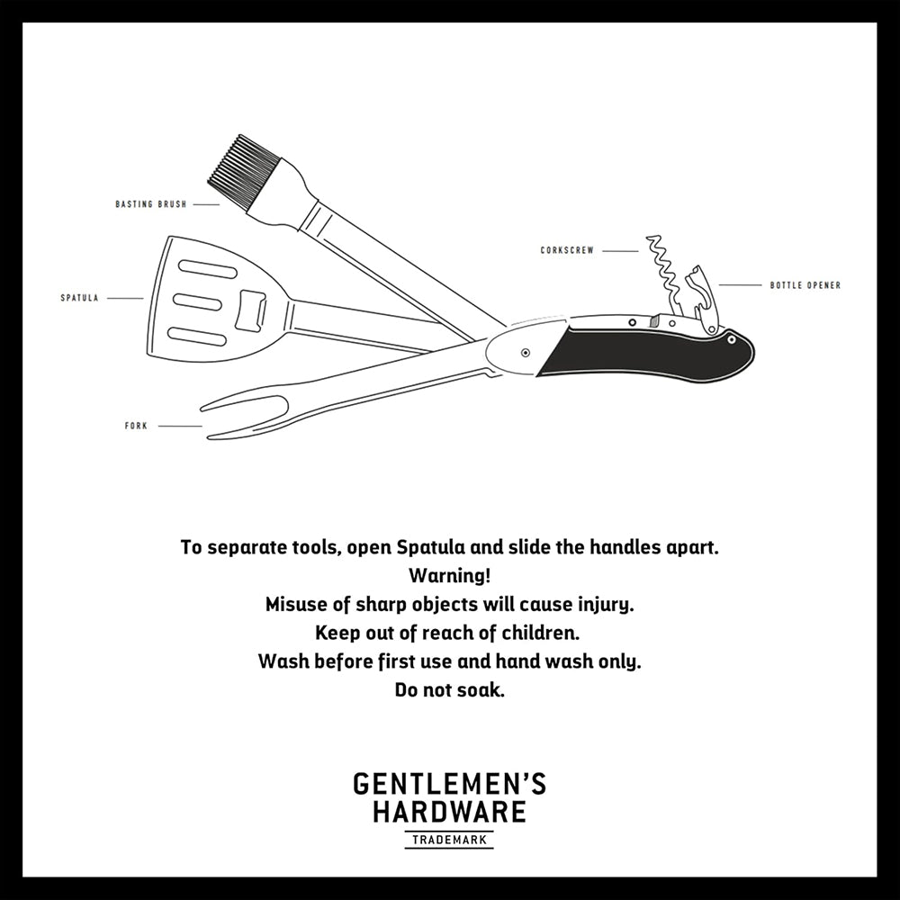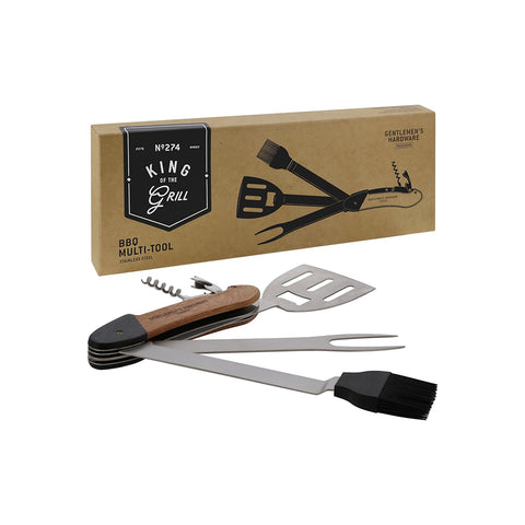 The Gentlemen's Hardware GEN274 BBQ Multi-Tool (also known as the "King of the Grill") is a heavy-duty, 5-in-1 portable tool designed to simplify outdoor cooking. It is particularly unique because its main components can detach for simultaneous use.